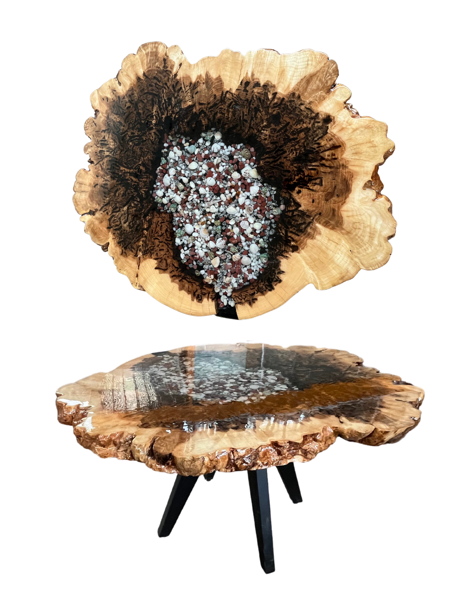 Table: Round Kitchen Dining: Epoxy Resign River Table w/ Canadiana Embedded Clear Casting: Custom Steel Legs