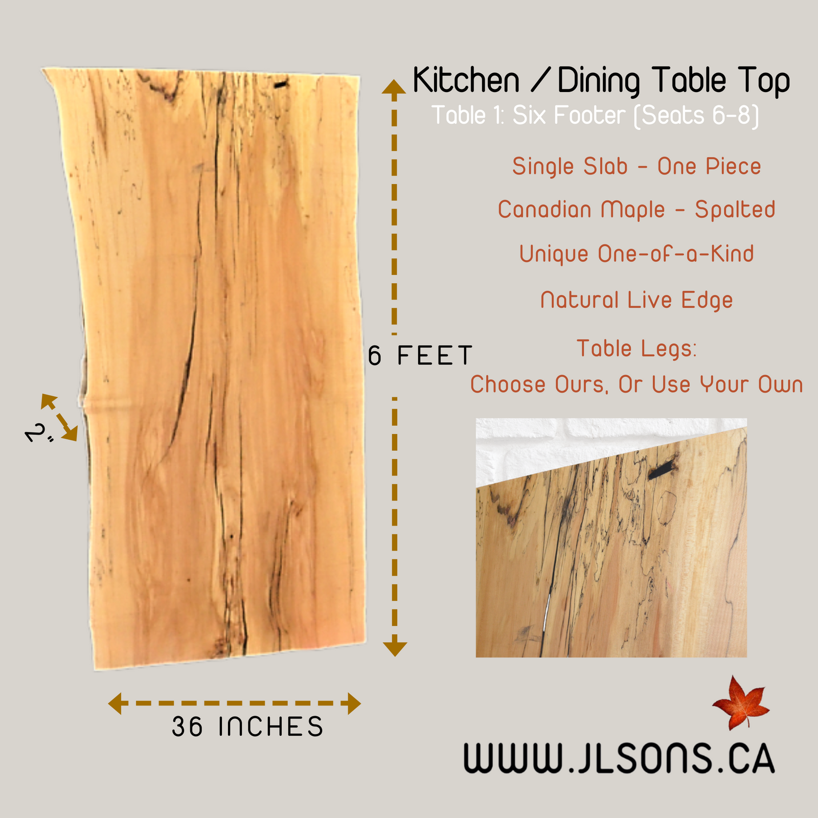 Maple Kitchen / Dining Table Top: 36" x 72" x 2" Spalted, Canadian Solid One Piece Slab