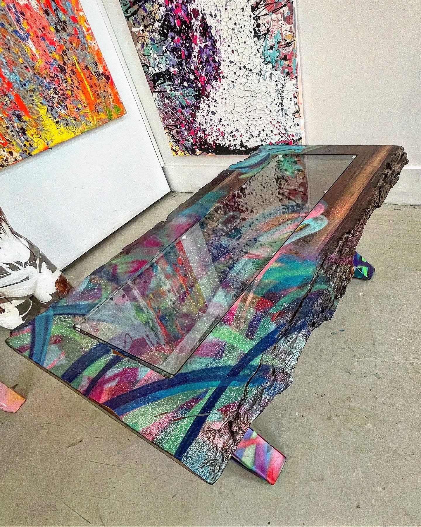 arTable: Walnut Coffee Table and Steel Legs with Original Art